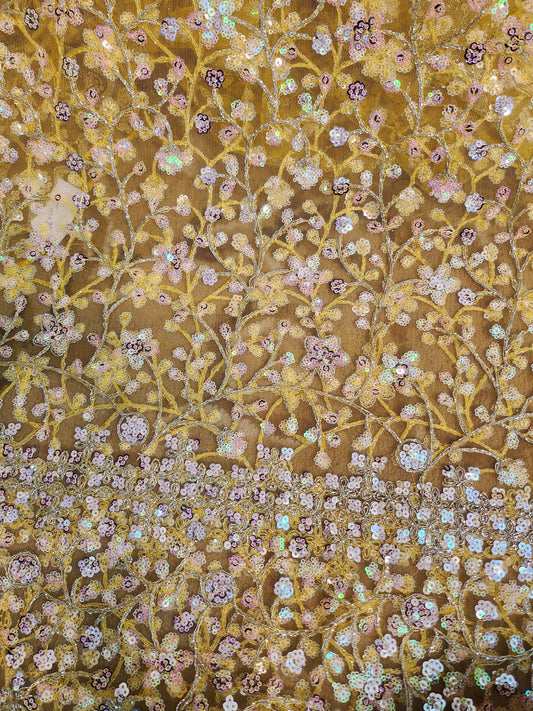 Net fabric Golden Color with floral pattern and sequence work