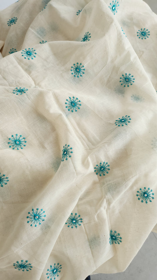 Pure Kora Cotton with Turguoise Sun Embroidery and Mirror Work