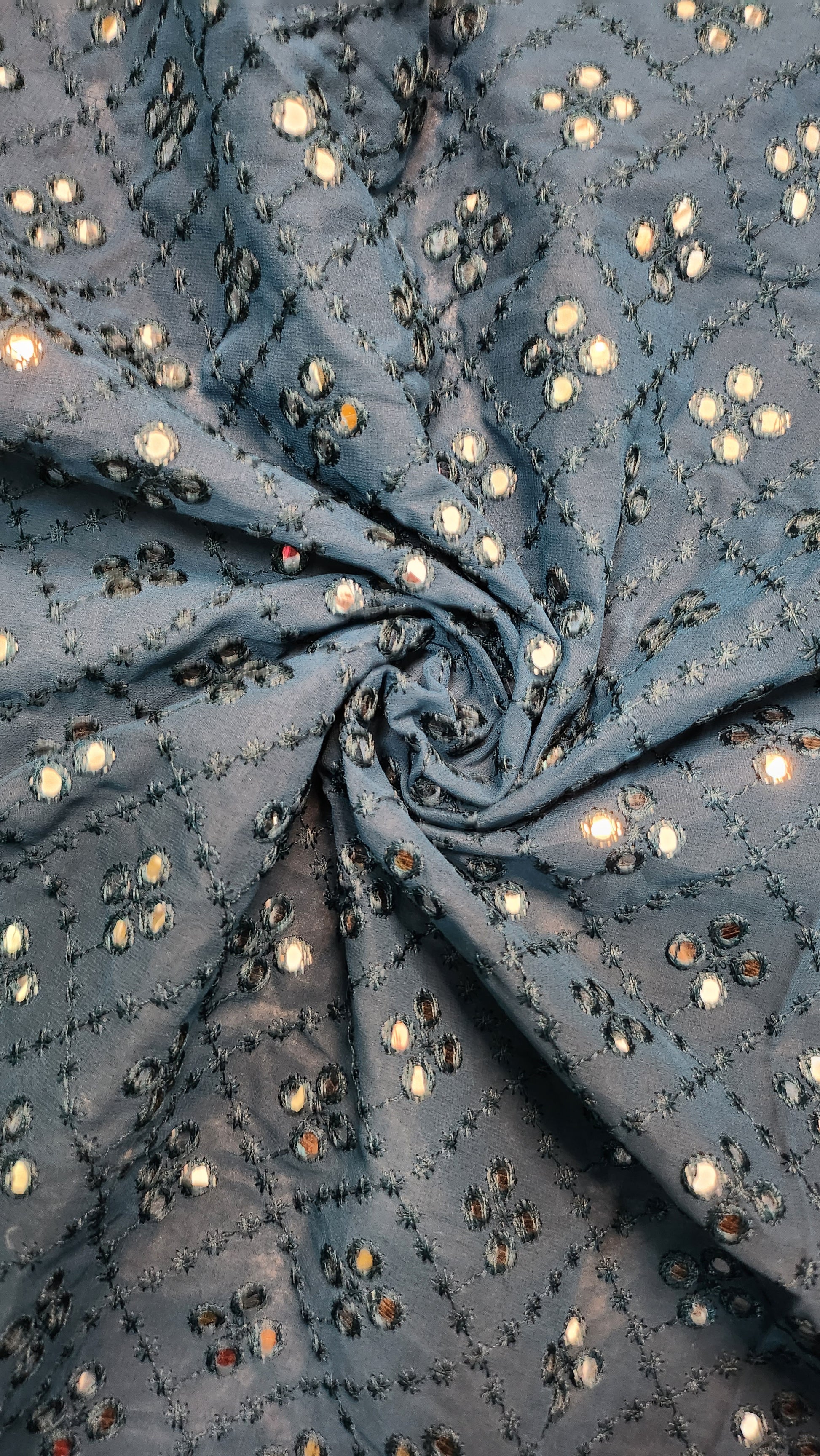 Discover the enchanting elegance of our Mirror Work Georgette fabric, a true embodiment of tradition and glamour. This exquisite fabric features intricate mirror work that sparkles with every movement, making it perfect for creating stunning ethnic wear, sarees, lehengas, and festive outfits.