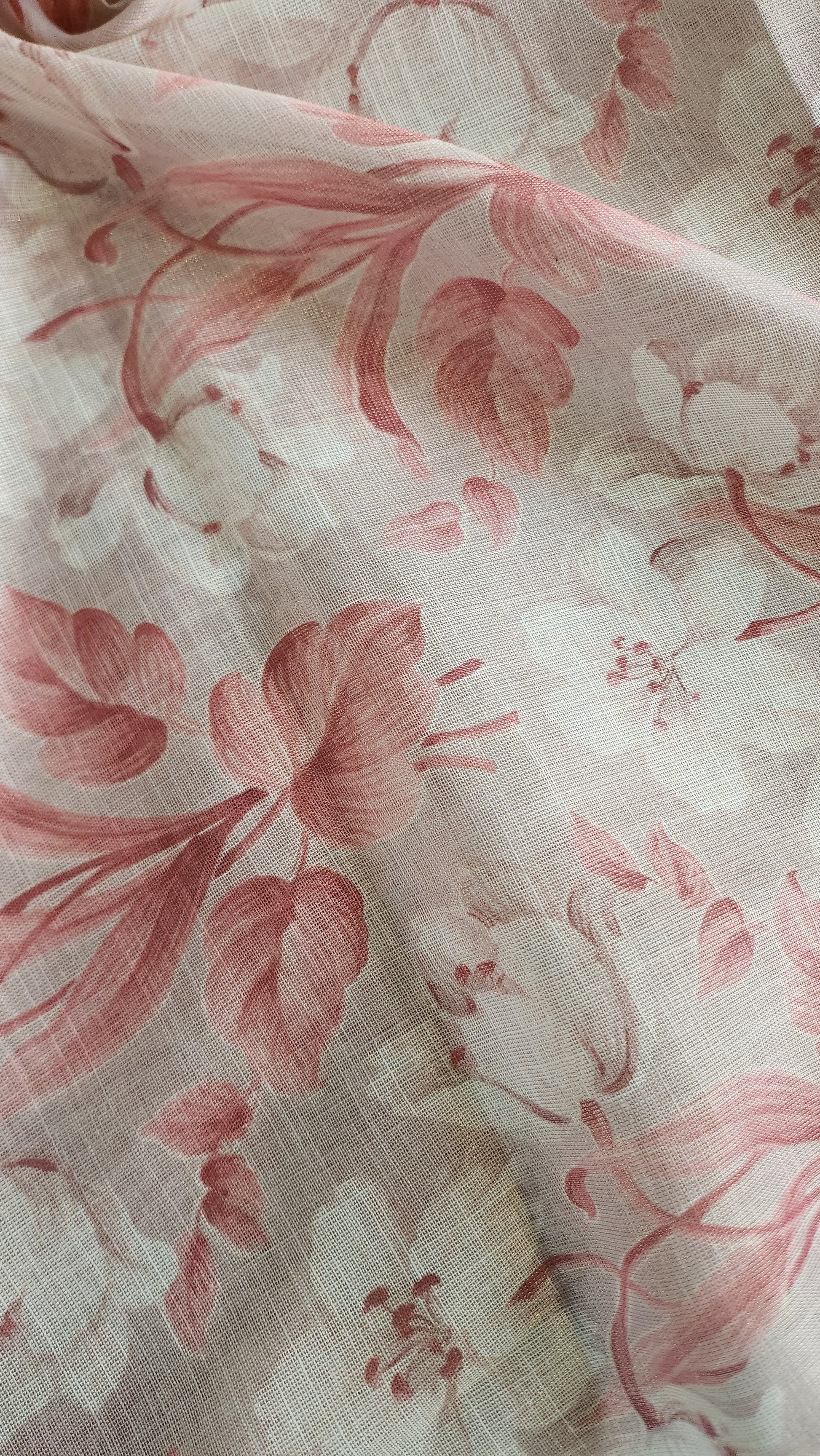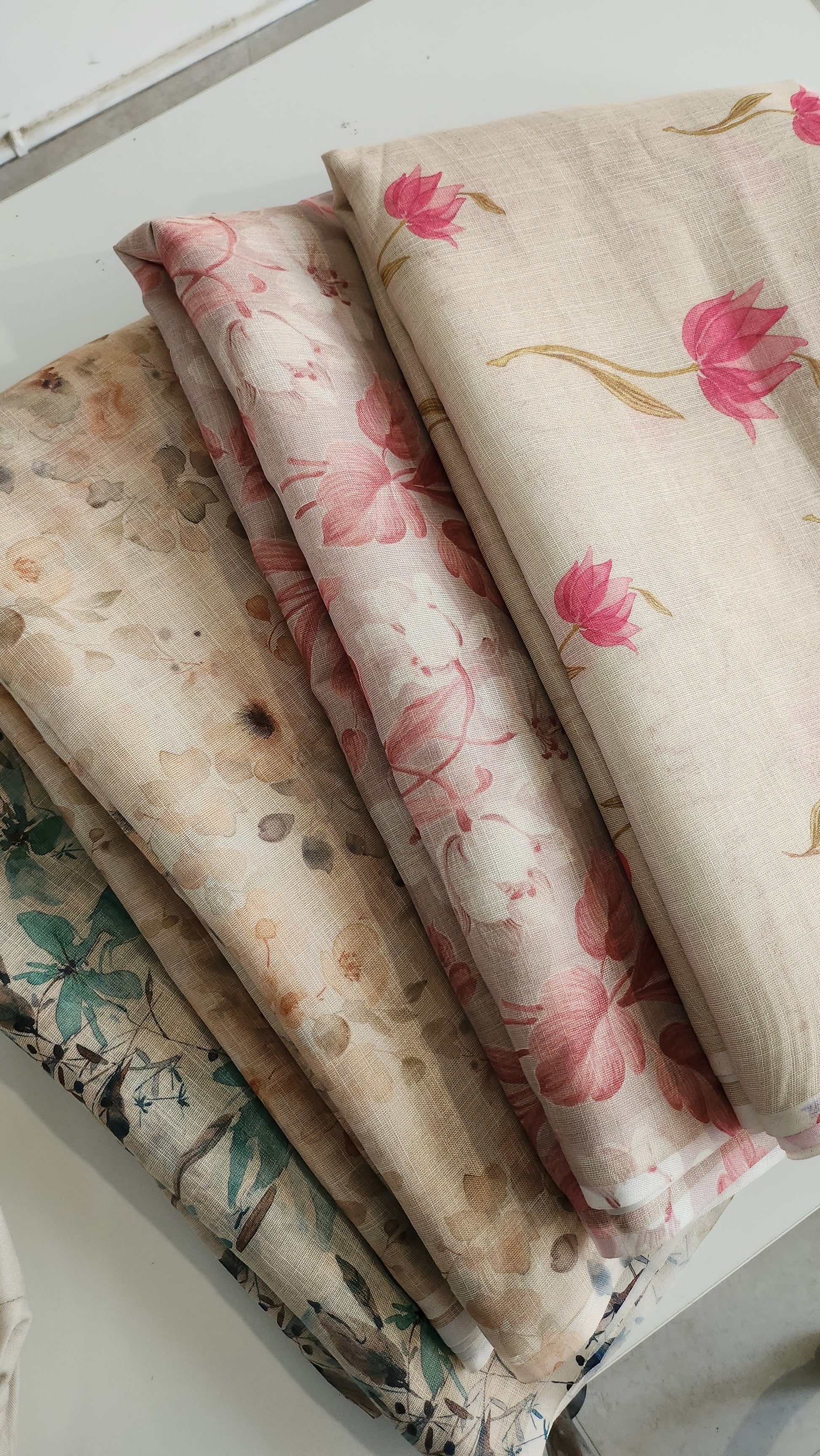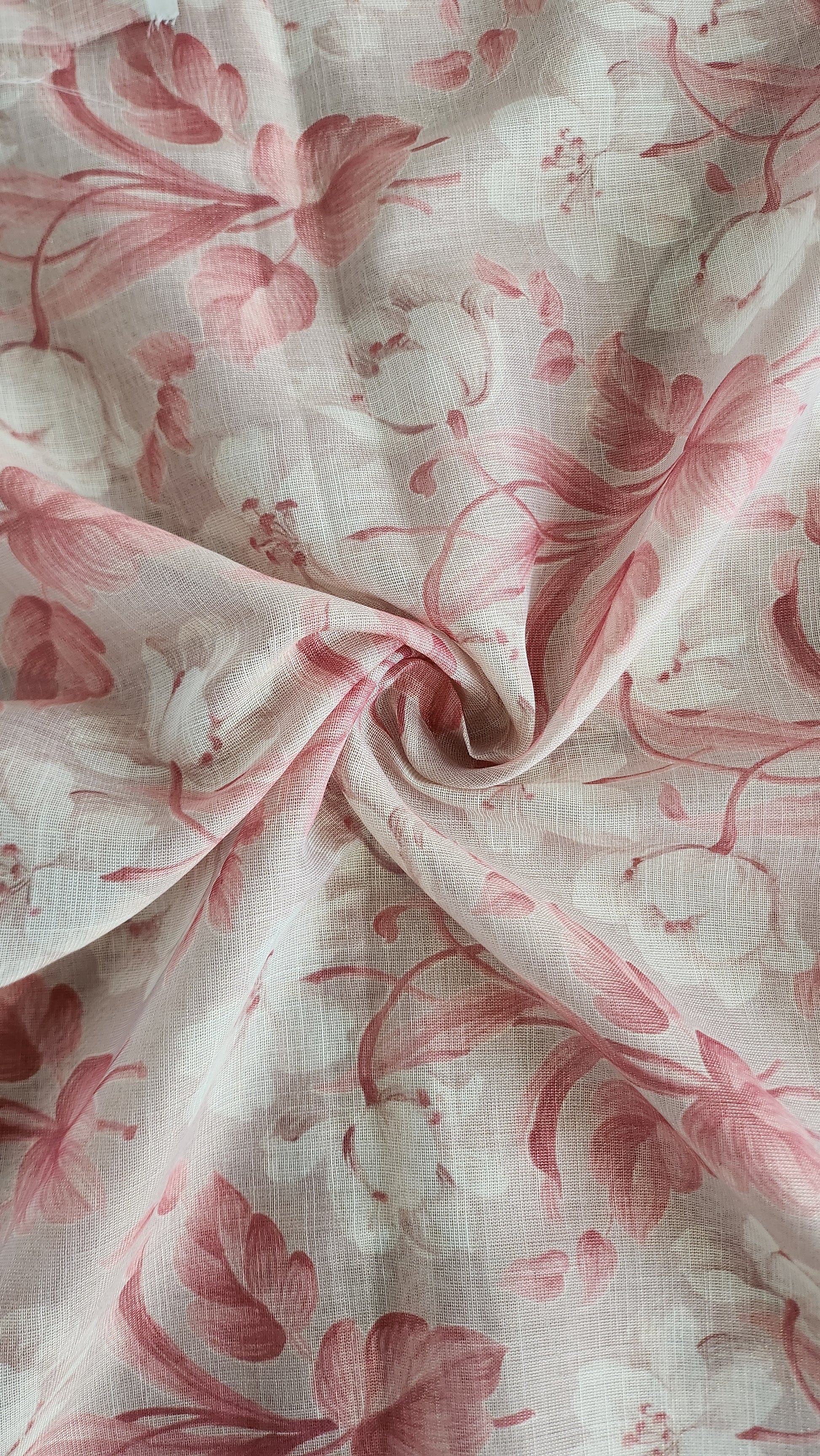 Crafted from premium cotton and linen flax yarns, this fabric showcases a soft peach/white floral design with light shimmer thread work for a subtle glow. Its breathable texture offers all-day comfort, making it ideal for kurtis, sarees, dresses, and shirts. Whether you're designing a cotton suit, a relaxed night suit for ladies, or stylish casual wear, this fabric combines elegance with everyday ease. Perfect for those seeking cotton fabric material, cotton suit design, or cotton linen fabric online.