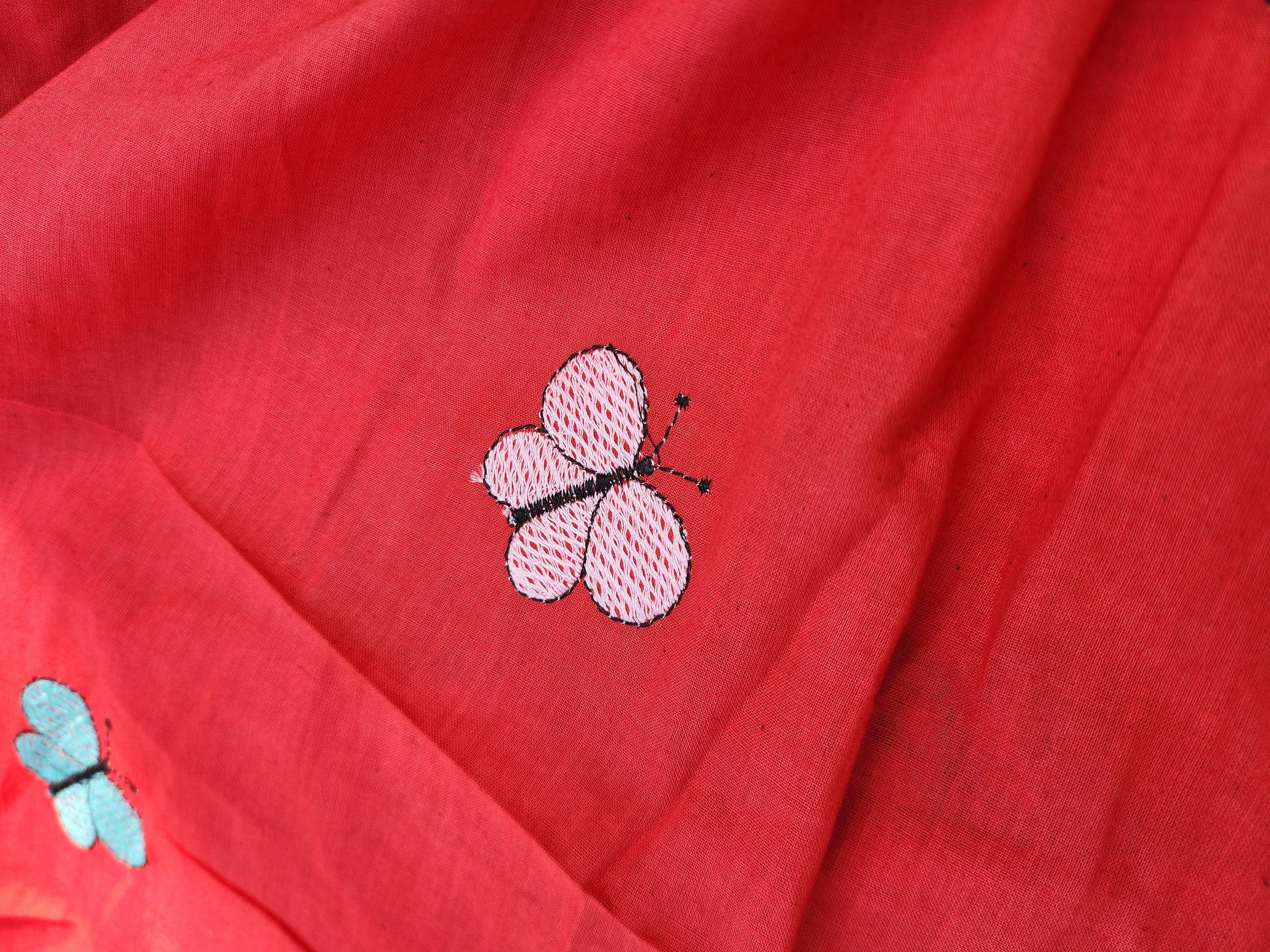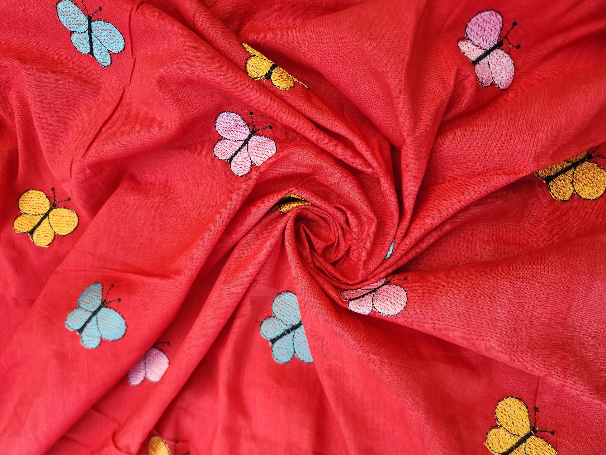 Dark Red Color Kora Cotton with Multi Color Embroidery Butterfly