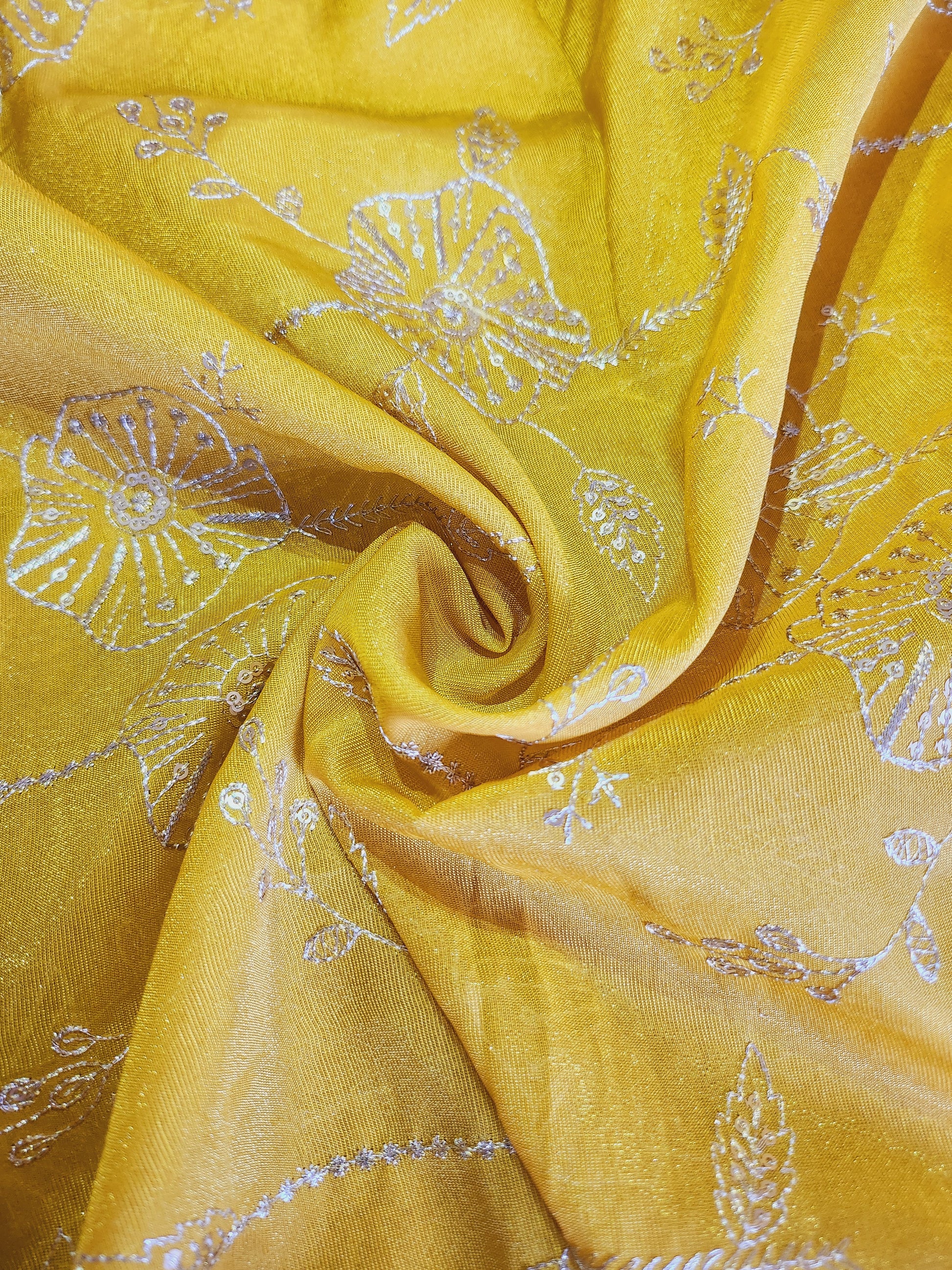 The golden zari detailing adds a touch of royalty, while the sequence embellishments bring a subtle sparkle, perfect for festive and bridal outfits. This fabric drapes beautifully, ensuring that every piece you create exudes sophistication and timeless charm.