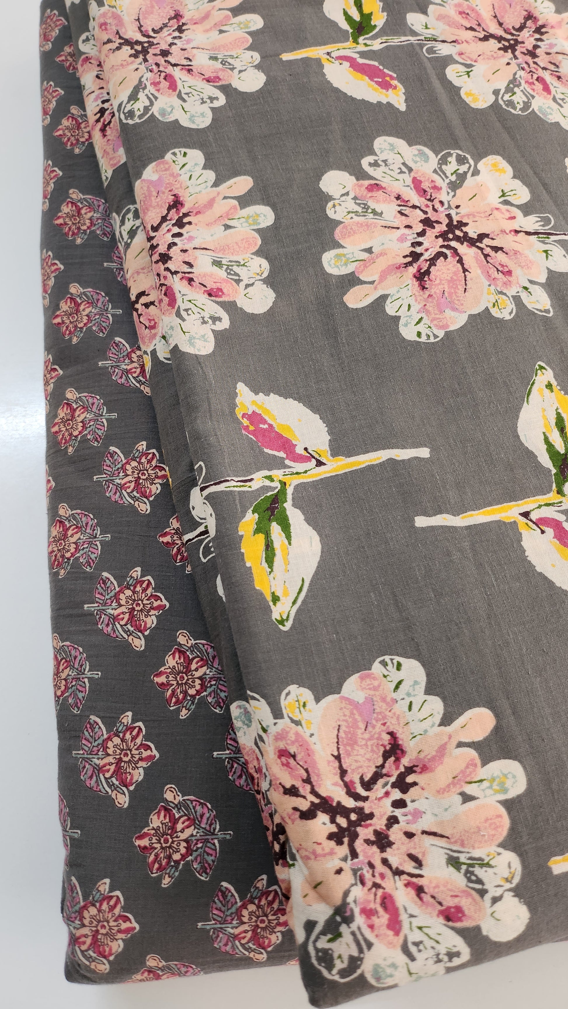 Brighten your wardrobe with this Gray Pure Cotton Suit Set featuring vibrant big floral prints on soft, breathable cotton fabric material. Designed for all-day comfort, it's ideal as a stylish cotton suit for women or a cozy cotton night suit for ladies. Perfect for both casual outings and relaxing at home. Explore more premium cotton suit designs and pure cotton fabrics only at Mrfabrics.in.