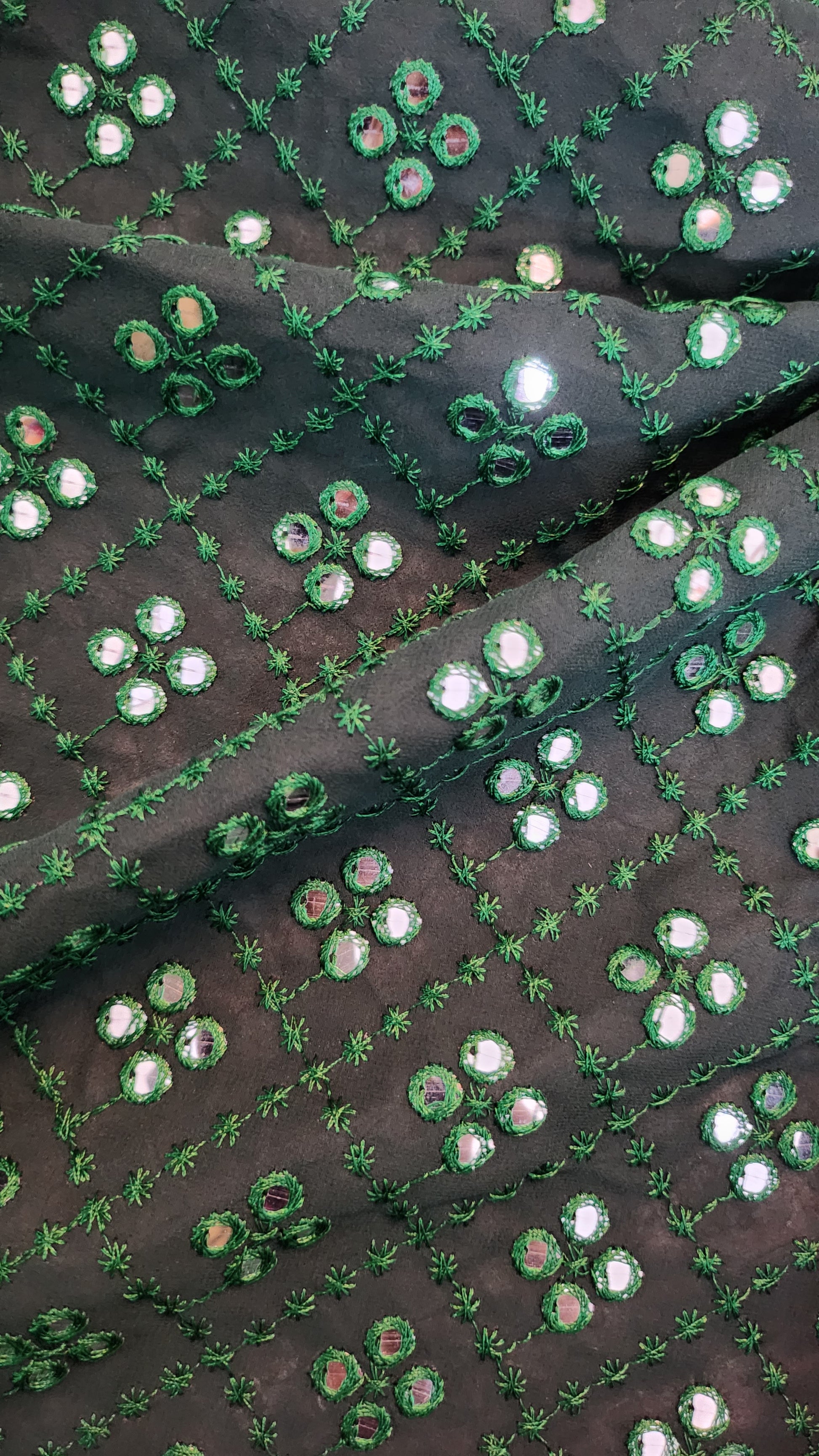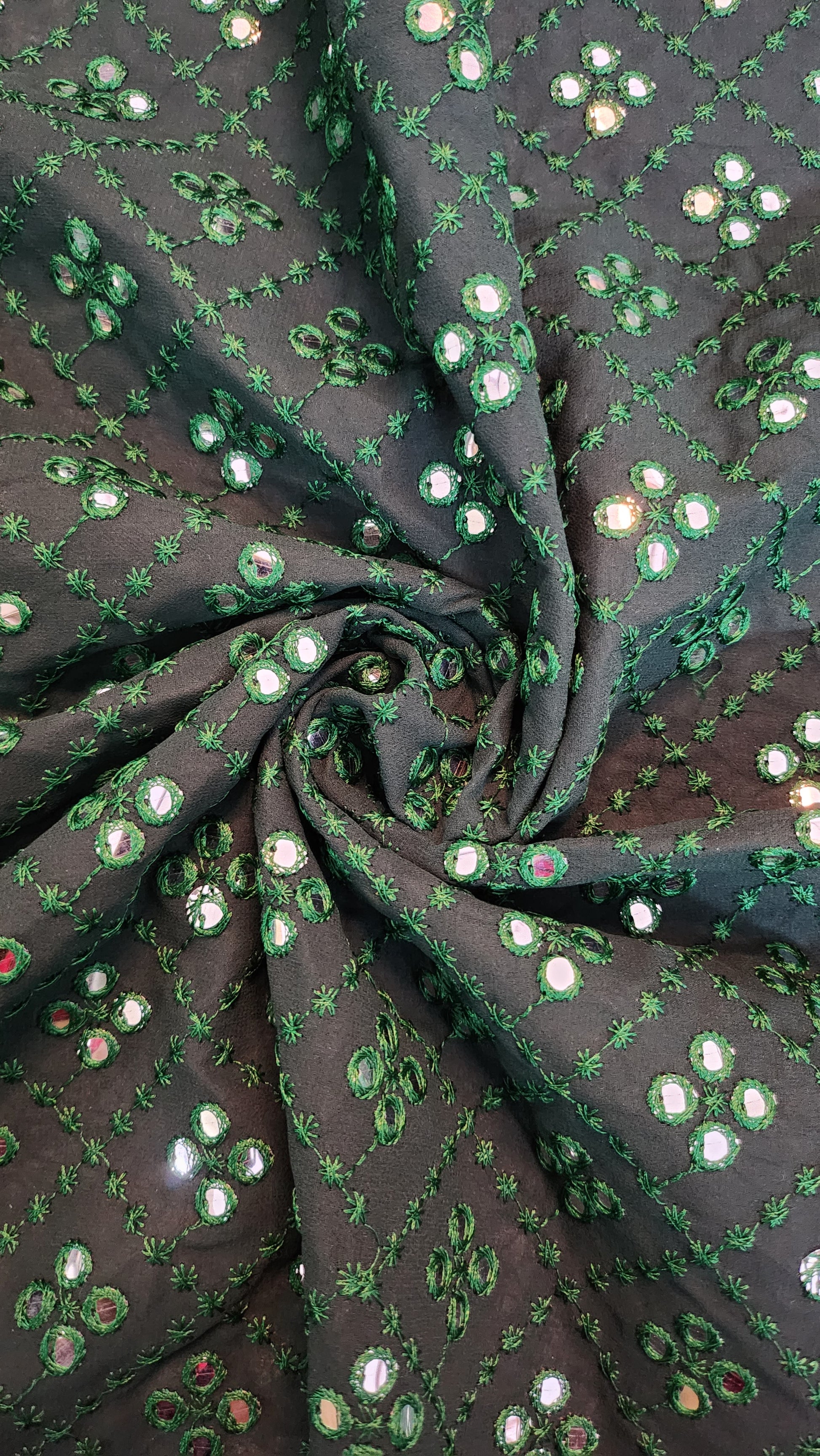 Discover the enchanting elegance of our Mirror Work Georgette fabric, a true embodiment of tradition and glamour. This exquisite fabric features intricate mirror work that sparkles with every movement, making it perfect for creating stunning ethnic wear, sarees, lehengas, and festive outfits.