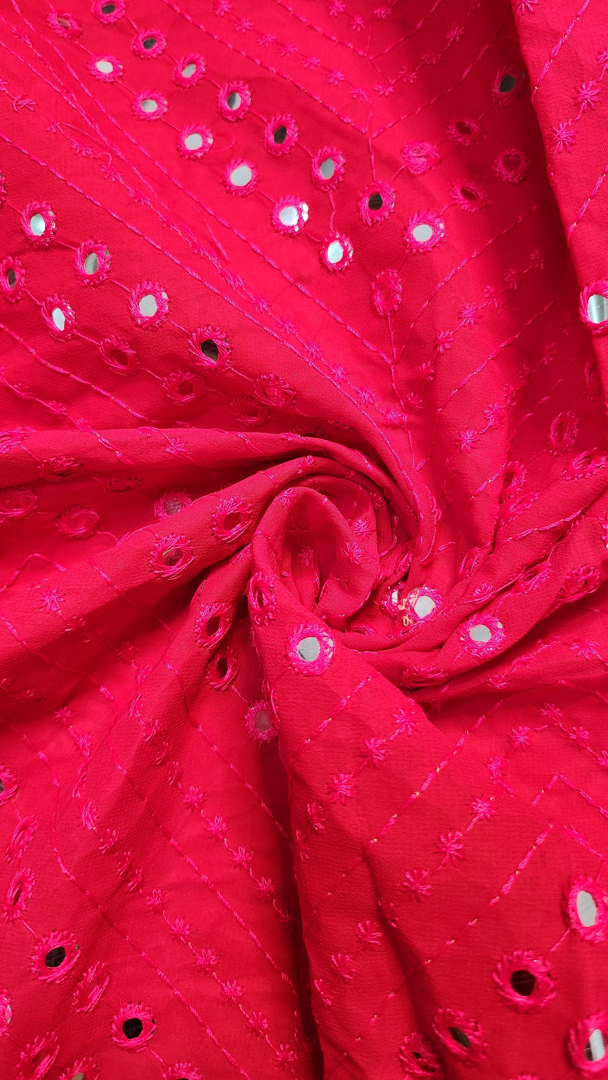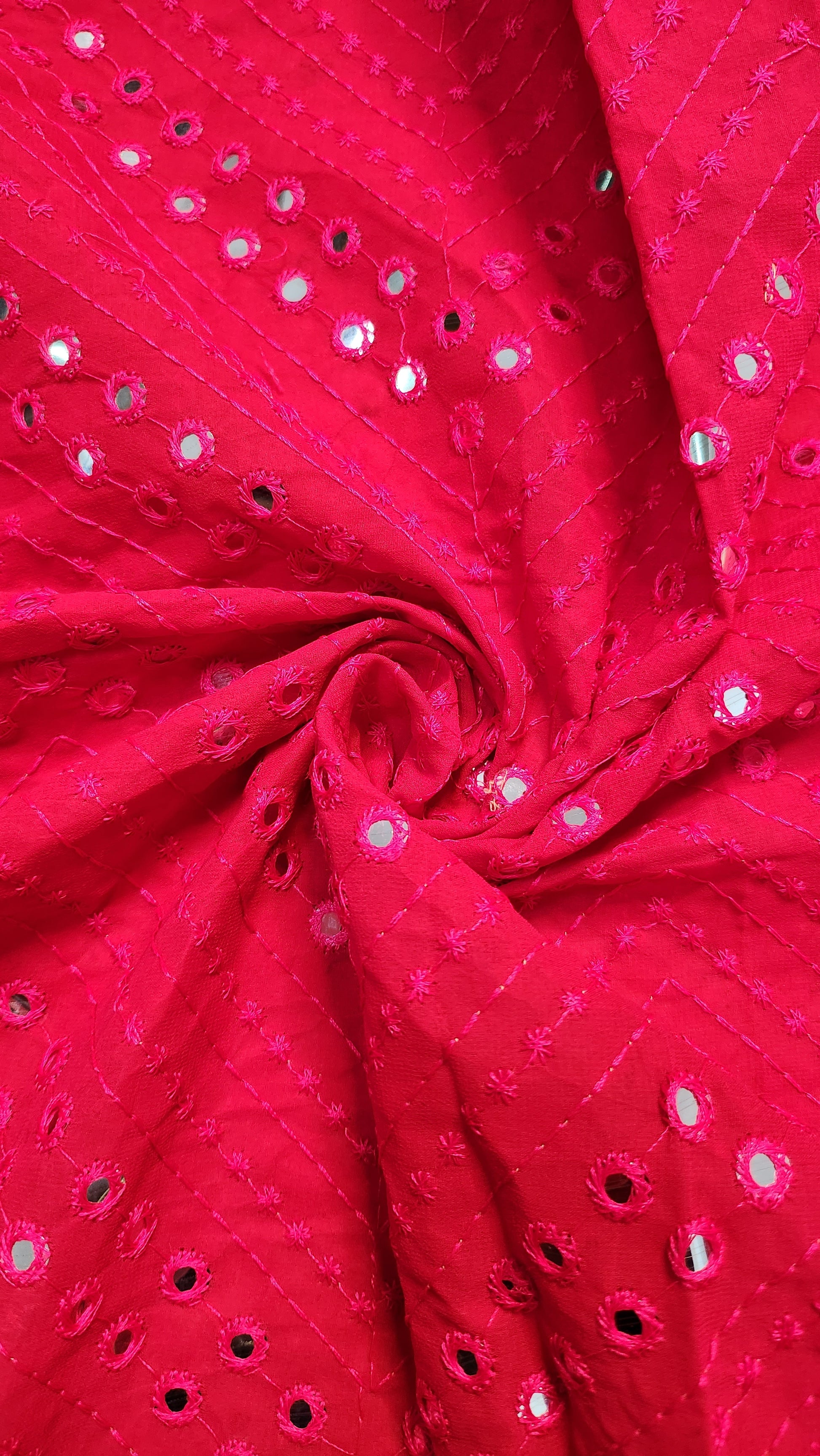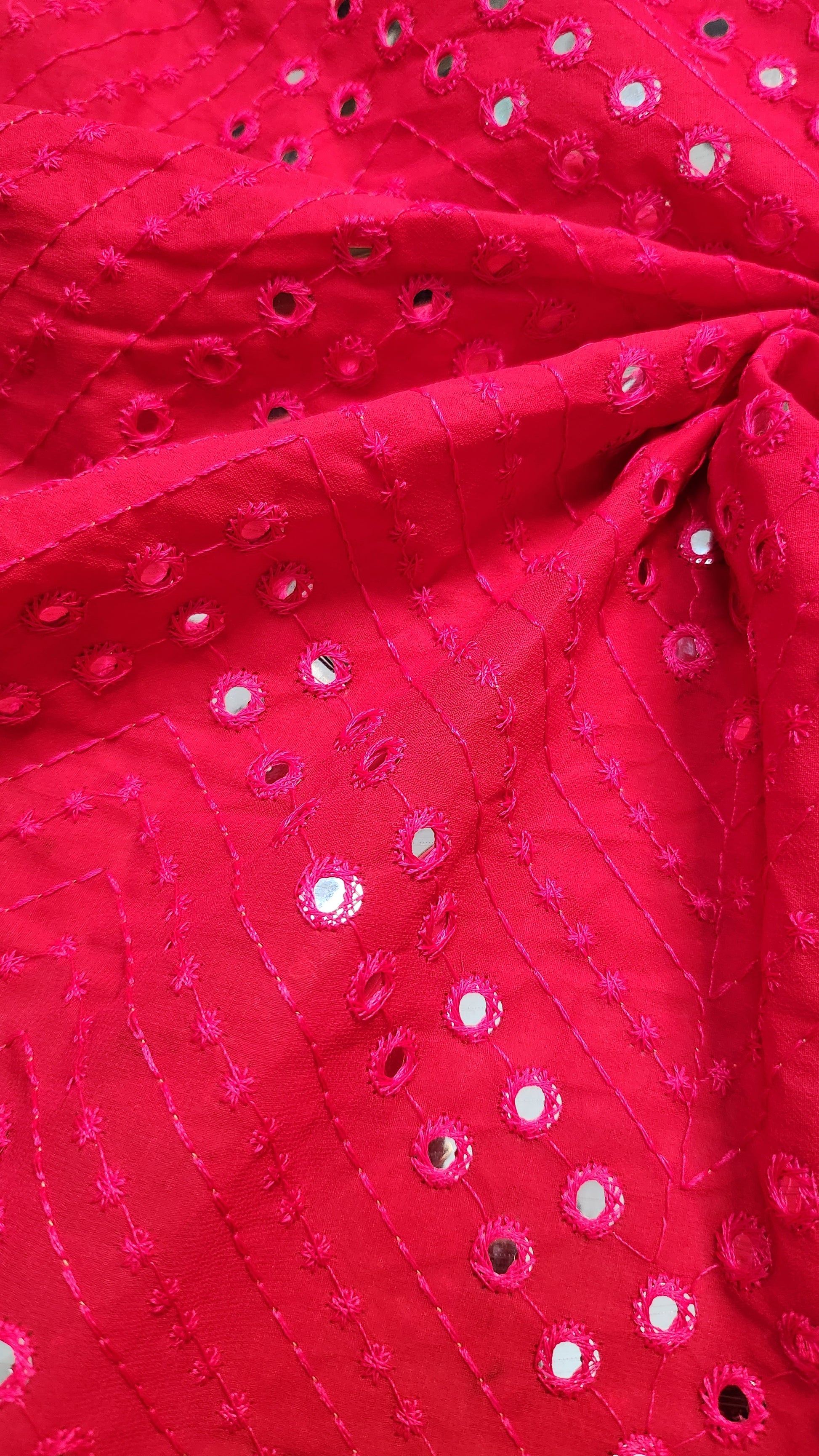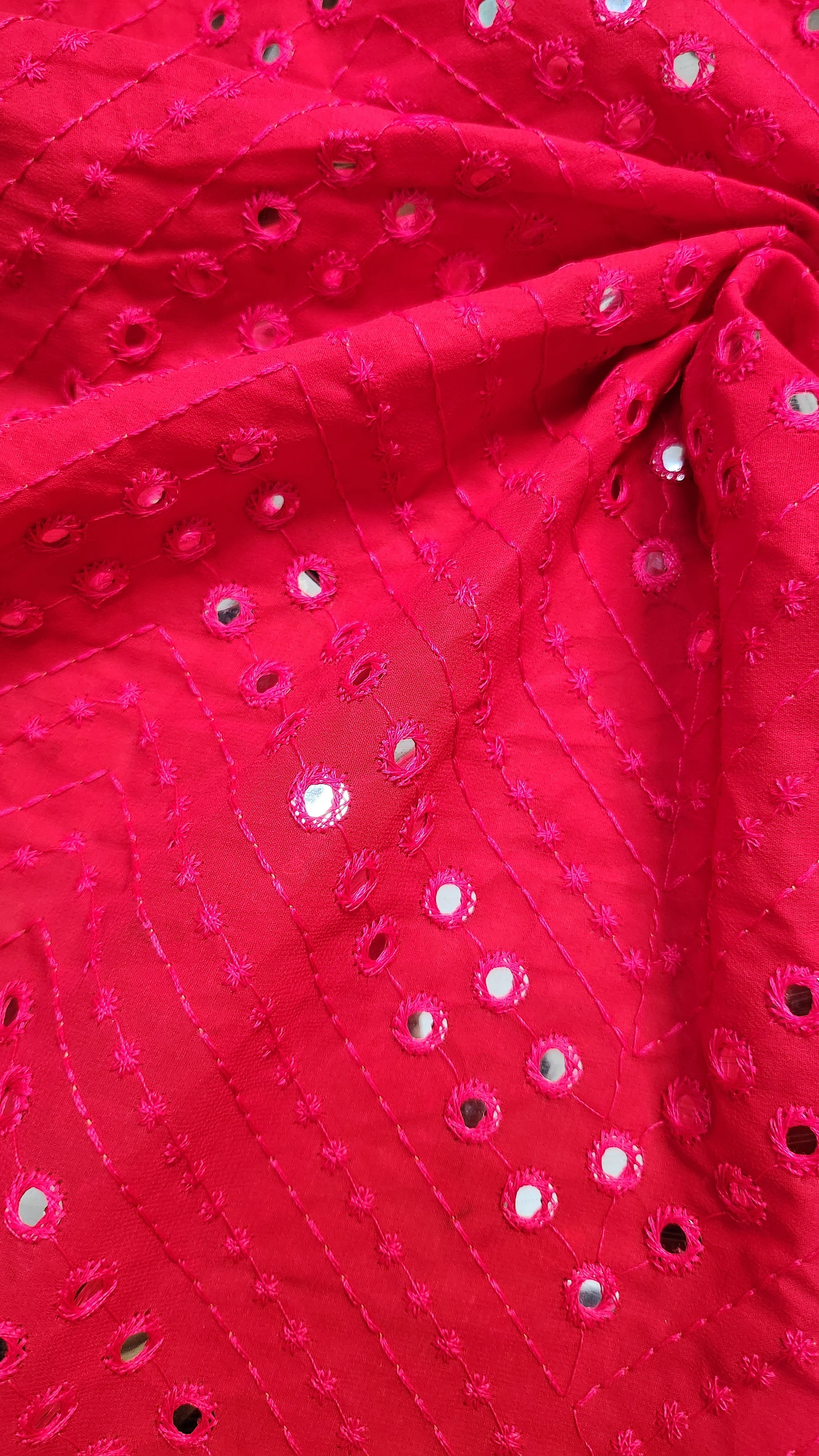 Discover the enchanting elegance of our Mirror Work Georgette fabric, a true embodiment of tradition and glamour. This exquisite fabric features intricate mirror work that sparkles with every movement, making it perfect for creating stunning ethnic wear, sarees, lehengas, and festive outfits.