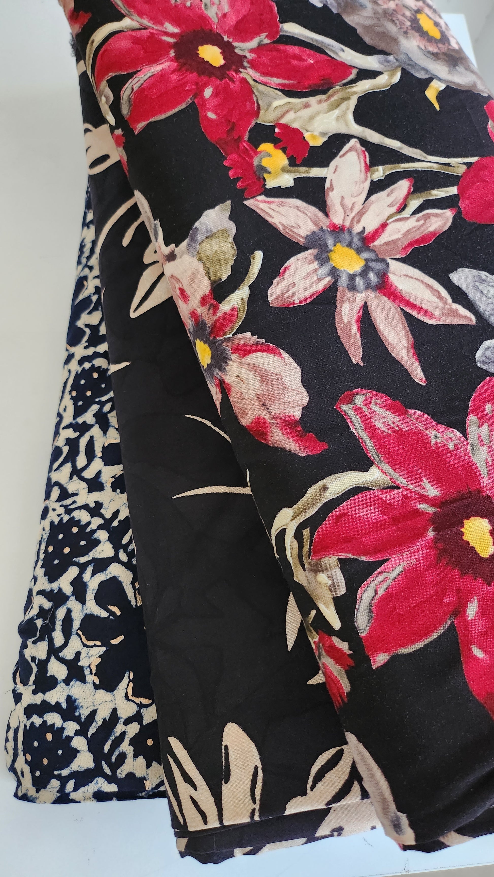 Add a touch of elegance with this Pure Rayon Cotton fabric, featuring a rich black base adorned with big multi-color floral prints and subtle abstract patterns. Crafted from soft, breathable rayon cotton fabric, it ensures all-day comfort and effortless style. Ideal for casual outings, festive occasions, or office wear, this fabric brings a bold yet graceful touch to your wardrobe.