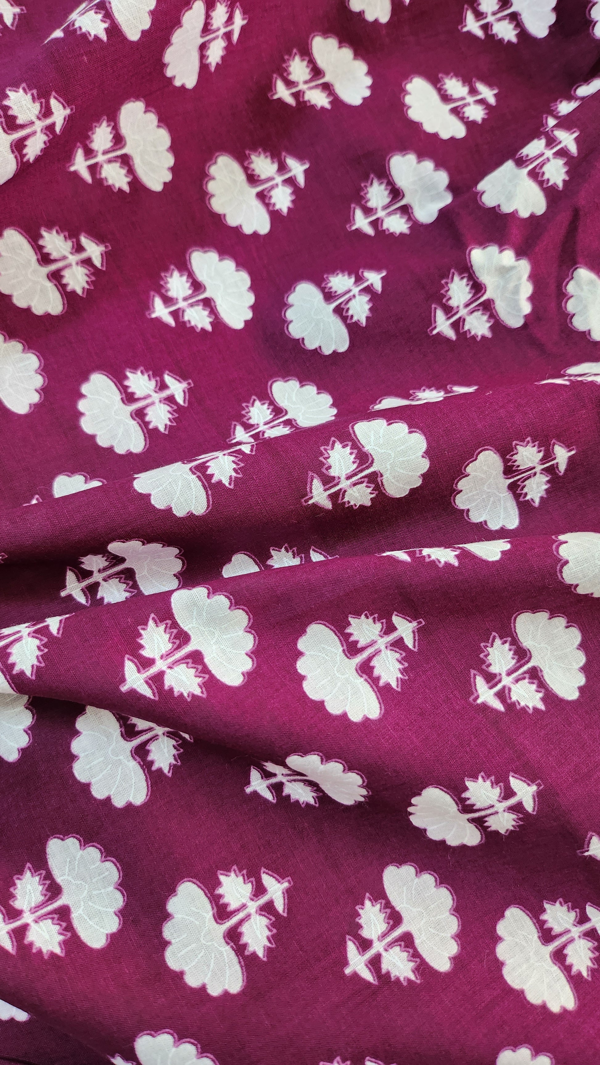 Add elegance to your wardrobe with this Wine Color Pure Cotton Fabric featuring bold white Small floral prints. Made from soft, breathable pure cambric cotton, it ensures all-day comfort and effortless style. Perfect for daily wear, whether as a chic cotton suit for women or a cozy cotton night suit for ladies. Upgrade your everyday look with this premium cotton fabric from Mrfabrics.in — where comfort meets timeless design.