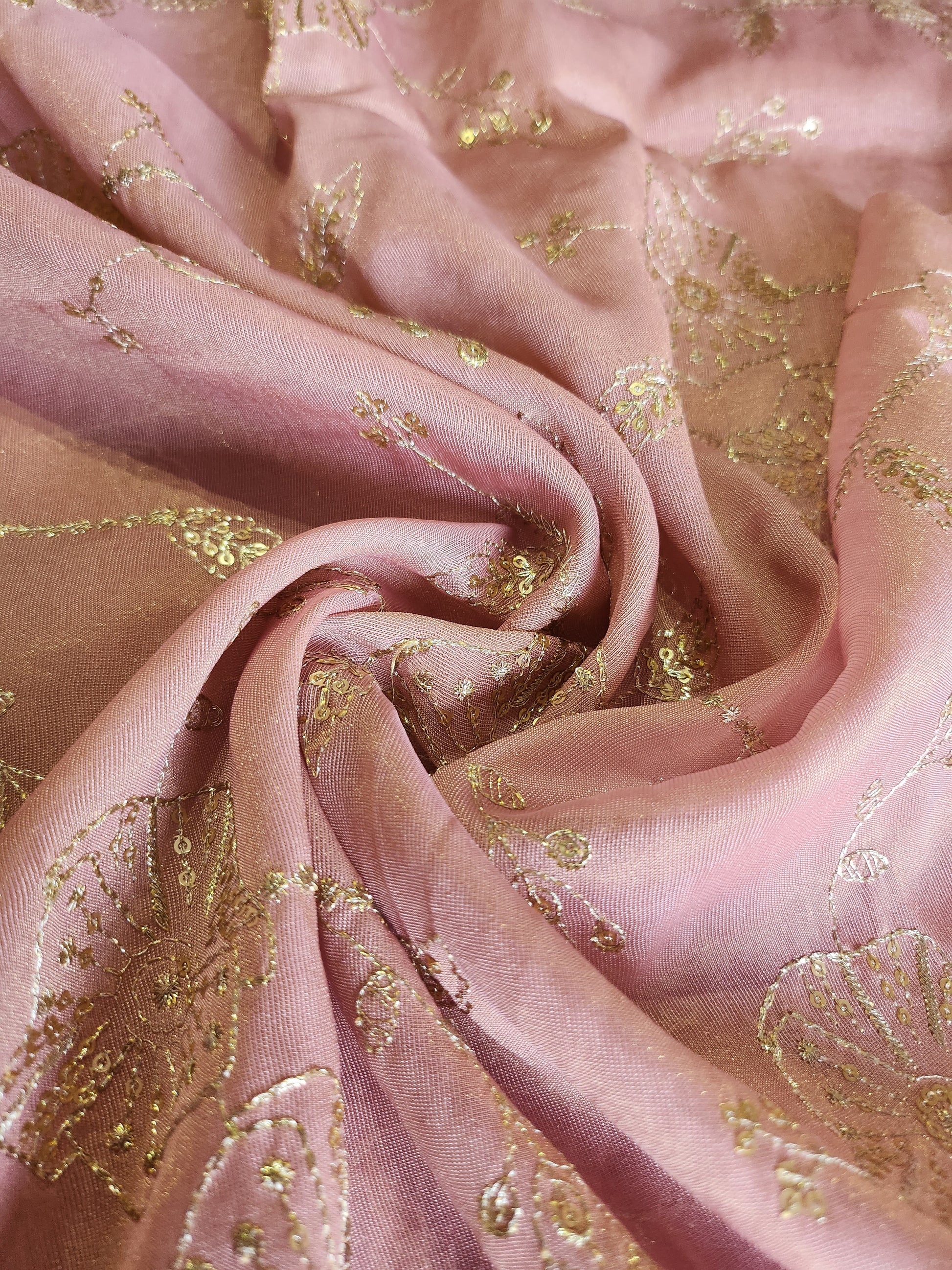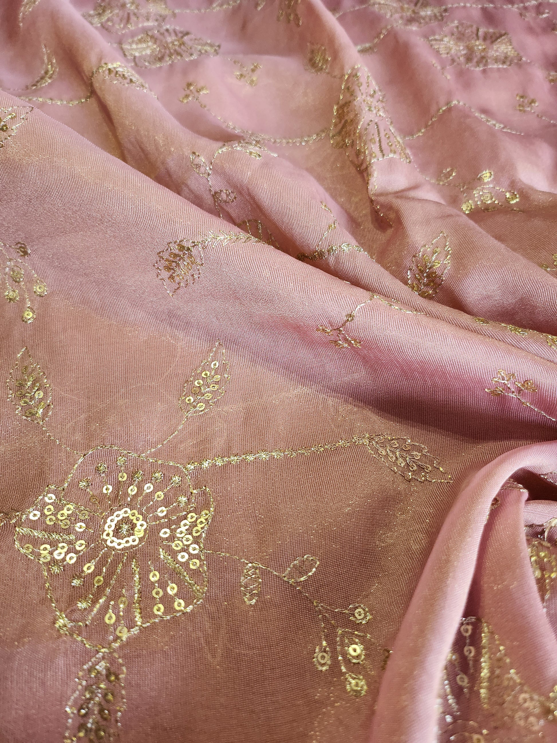 The golden zari detailing adds a touch of royalty, while the sequence embellishments bring a subtle sparkle, perfect for festive and bridal outfits. This fabric drapes beautifully, ensuring that every piece you create exudes sophistication and timeless charm.